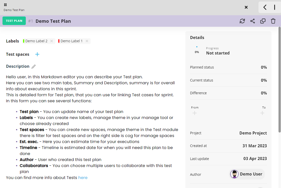 To create a test plan, simply click on "+ Test Plan" bar and press Enter. The Test Plan Modal will appear. After editing the Test Modal, click on CREATE and the next TP modal would apppear. It is very useful for writing Analyses. To be able to edit the test plan, you need to open the test plan edit form (by clicking on its name). In the test plan edit form you can also check the Summary and write a Description of the test plan.